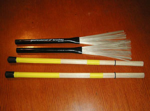 上のほうきのような楽器は"ブラシ"。静かなジャズの演奏によく使われ、焼きそばを焼く時のように動かすのだそうです。下の楽器は"バンブーロッド"。これは(ドラムの)スティックと同じように使うものらしいです。アタックが弱いので、音量をセーブできる利点があります。