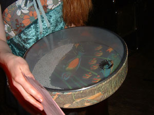 "るーとうえきどん"のライブ(2005/04/13)でるーさんが実際に使われていた楽器。楽器名に関してはネットで調べてからるーさんに確認を取りました。"オーシャンドラム(Ocean Drum)"という名前で通っているらしいのですががそれは商品名だそうです。両手で持ってゆるやかに操作すると中に入っている粒々が移動し、海の波の音が作り出されます。日本では小豆を入れた大きなザルを両手で操ることで波の音を演出しますね。