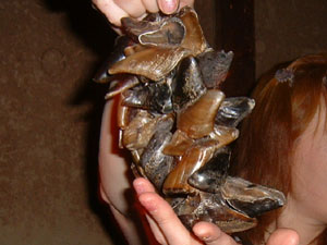 "るーとうえきどん"のライブ(2005/04/13)でるーさんが実際に使われていた楽器。南米の楽器で"カラカラ"と乾いた音が鳴ります。アルパカ・リャマ(共にラクダ科)の爪で作られることもあるそうです。現地での楽器名はおそらくチャスチャス(Chaschas)。